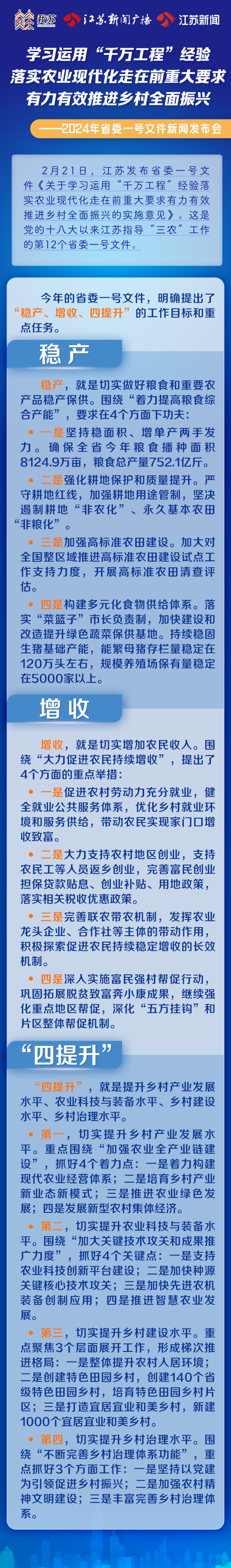 我苏客户端讯 2月21日,江苏省委发布2024年一号文件——《关于学习运用“千万工程”经验落实农业现代化走在前重大要求有力有效推进乡村全面振兴的实施意见》。22日,省政府新闻办公室召开新闻发布会,就省委一号文件进行解读。记者了解到,“稳产、增收、四提升”是今年省委一号文件的三大关键词,围绕这三大关键词,文件提出了一批有含金量的政策措施。