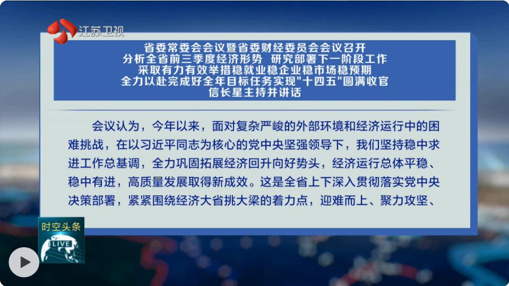 10月17日,省委常委会会议暨省委财经委员会会议召开,深入学习贯彻习近平总书记关于做好经济工作的重要指示和对江苏工作重要讲话精神,分析全省前三季度经济形势,研究部署下一阶段工作。省委书记信长星主持会议并讲话。