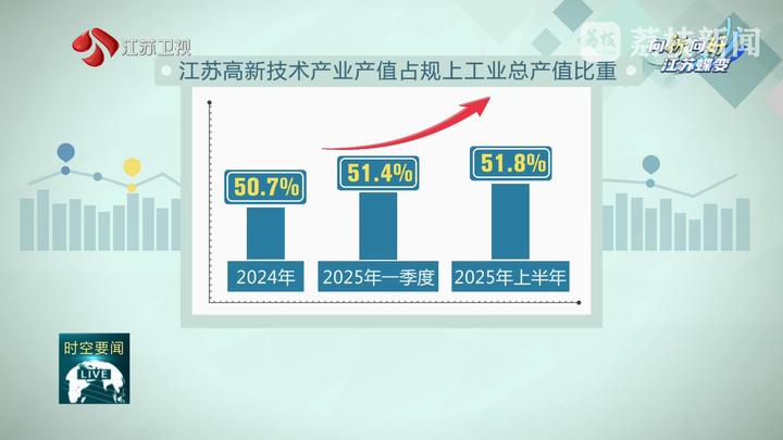 从新兴产业到传统产业,从实验室到生产线,新动能新活力在江苏积厚成势,全省高新技术产业产值占比从去年的50.7%,到今年一季度51.4%,再到上半年51.8%,呈现节节攀高的势头。