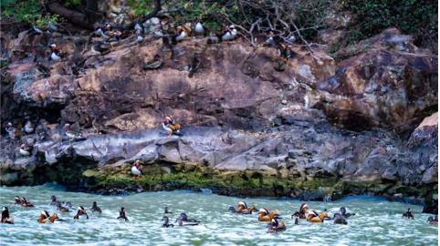 深秋的太湖鼋头渚,层林尽染,碧波如镜,最浪漫的“限定嘉宾”——第一批鸳鸯如约抵达。雄鸟华贵艳丽,雌鸟素雅端庄,它们或伏崖而息,或蹲岩远眺,或游弋湖中,一派悠然自得的模样,为这幅江南山水画卷增添了无限生机。据了解,今秋前来“报到”的鸳鸯数量已逾300只。随着气温逐渐走低,预计下个月这一数字还将翻一番。