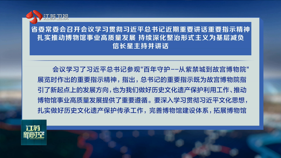 会议学习了习近平总书记参观“百年守护——从紫禁城到故宫博物院”展览时作出的重要指示精神,指出,总书记的重要指示既为故宫博物院指引了新起点上的发展方向,也为我们保护好、传承好历史文化遗产、推动博物馆事业高质量发展提供了重要遵循。要深入践行习近平文化思想,扎实做好历史文化遗产保护传承工作,完善博物馆建设体系,拓展博物馆教育功能,努力把我省博物馆打造成为弘扬中华优秀传统文化的重要阵地。