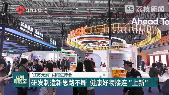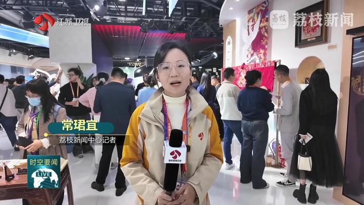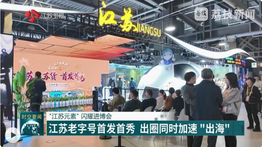 荔枝新闻中心记者常珺宜说:“我现在是在第八届进博会江苏人文展区,这里正上演着一场前沿科技与传统匠心的精彩碰撞!55家重点老字号与高科技品牌齐聚,带来了多款首发的吸睛展品。”