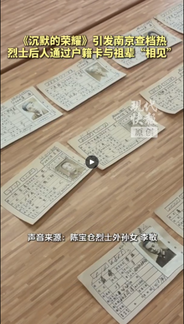 陈宝仓烈士的外孙女李敏今年66岁,她的母亲是陈宝仓的三女儿陈禹芳。“《沉默的荣耀》引起了广泛关注,我们也挺高兴,让我们的前辈从无名到有名。”李敏在接受采访时表示,她曾经听妈妈说过,家里是从南京搬到上海,然后从上海到广州,从广州去的台湾。至于家人当时在南京住在哪里,他们作为后辈并不清楚。李敏表示,这批户籍卡的存在,令她感到很惊讶。她还表示,有机会会和家人一起来南京寻访外祖父的足迹。