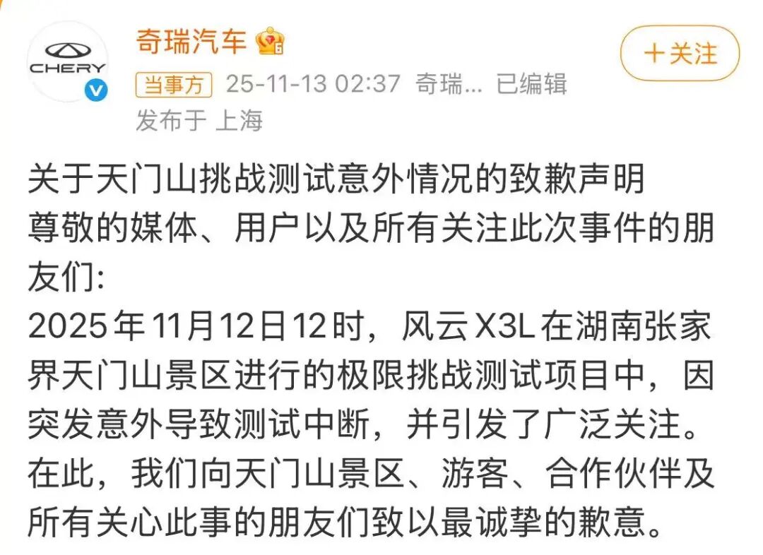 事发后,奇瑞连夜致歉,承诺修复赔偿。
