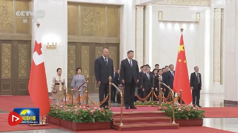 会见前,习近平和夫人彭丽媛在人民大会堂北大厅为图普六世和王后娜娜茜帕乌举行欢迎仪式。
