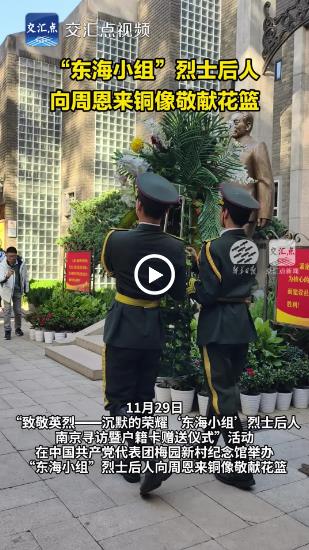 为深切缅怀隐蔽战线英烈的卓越功勋,弘扬爱国主义精神,传承红色基因,11月29日,“致敬英烈——沉默的荣耀‘东海小组’烈士后人南京寻访”活动在中国共产党代表团梅园新村纪念馆启动。烈士后人向周恩来铜像敬献花篮。本次也是“东海小组”烈士后人首次齐聚南京。