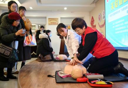 2024年1月17日,在天津市和平区新兴街朝阳里社区,医务人员和志愿者为社区居民讲解心肺复苏知识。新华社记者 赵子硕 摄