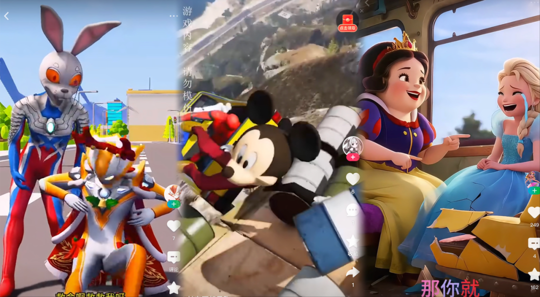 “兔头面具奥特曼打晕绑架小奥特曼”“米奇在山顶脚踹蜘蛛侠”“白雪公主霸凌艾莎”