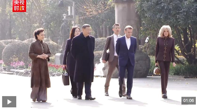 初冬的都江堰,苍山掩翠。马克龙夫妇抵达时,受到习近平和彭丽媛热情迎接。两国元首夫妇沿堰功道边走边谈。习近平介绍都江堰历史和意义,指出都江堰水利工程是全世界迄今唯一仍在使用的古代水利工程,也是人类与自然和谐共生最早的成功实践之一,修建过程充分反映了中华民族自强不息、不畏艰难、勇于开拓的精神。两国元首夫妇落座怀古亭,临水品茗,纵论天下。