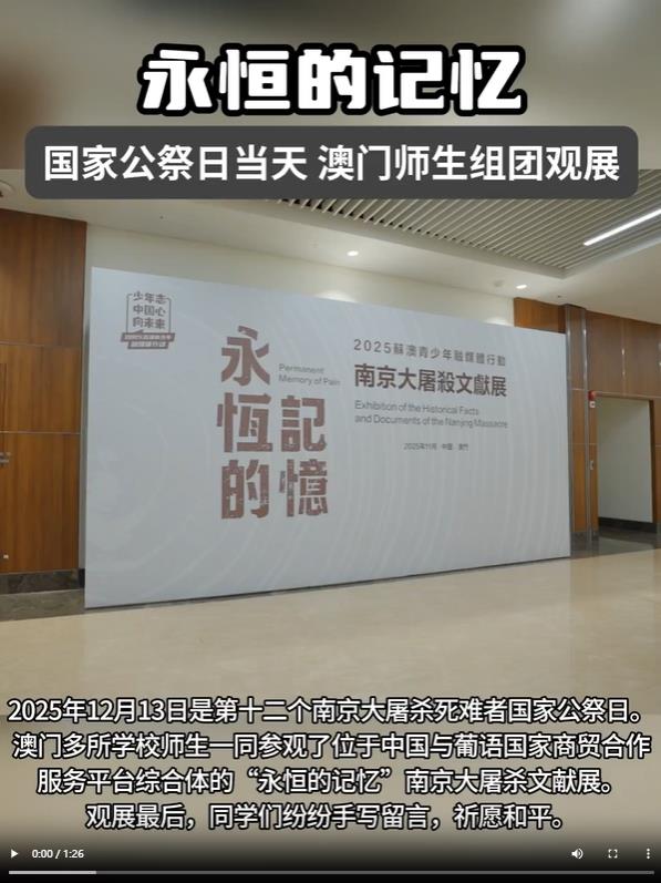 铭记历史,吾辈自强!2025年12月13日是第十二个南京大屠杀死难者国家公祭日。澳门多所学校师生一同参观了位于中国与葡语国家商贸合作服务平台综合体的“永恒的记忆”南京大屠杀文献展。在澳门口述历史协会讲解员的介绍下,同学们认真浏览每一份文献、每一张照片,对这段沉痛的历史有了更深入的了解。观展最后,同学们纷纷手写留言,祈愿和平。