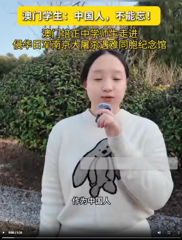 “选择侵华日军南京大屠杀遇难同胞纪念馆作为南京研学首站,是希望同学们直面这段用生命写就的惨痛历史,真正明白先辈们用血肉换来的和平来之不易。”柯志华老师告诉记者,拥有136年悠久历史的澳门培正中学一直致力于培养爱国爱澳青年。今年,同学们不仅在澳门参观了“少年志·中国心·向未来”2025苏澳青少年融媒体行动的重要活动——“永恒的记忆”南京大屠杀文献展,还积极参加了系列活动的另一项“爱国的奋斗 青春的赛场”主题演讲征集,相信同学们一定能在自己人生的成长和发展中把爱国情、强国志转化为报国行。