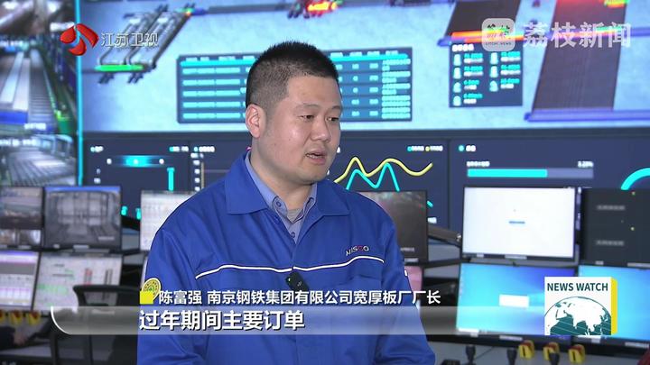南京钢铁集团有限公司宽厚板厂厂长陈富强说:“过年期间主要订单还是发往中东一些出口的,包括国内的风电等能源用钢,还有一些结构用钢。特别是海外出口的订单,因为国外不放假,所以说这个时候有很多钢板要拖到江阴港、上海港去集港,国内的好多客户大年初三初四就开始动工了,这样我们先把货就可以发过去。”