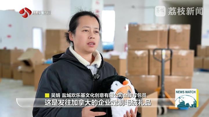 盐城欢乐基文化创意有限公司仓库打包员吴娟说:“这是发往加拿大的企业定制毛绒礼品,按照客户要求检查三次毛绒玩具的缝线 填充和LOGO的印制效果,一点差错都不能出。我本来订了回江西老家的高铁票,但现在看到订单量这么多,我就主动退票了。”