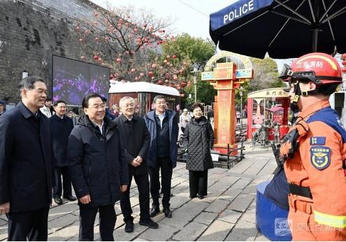 位于秦淮区的门东历史文化街区,张灯结彩、人潮熙攘。信长星、刘小涛察看街区风貌、美食市集,听取秦淮灯会、民俗活动举办情况介绍,与市民游客交流。在沿街店铺,信长星、刘小涛了解云锦工艺品、茉莉花饼的制作技艺、销售等情况,鼓励大家深入挖掘地域文化元素,传承好非物质文化遗产,推出更多特色文旅产品,要求有关方面进一步优化交通、餐饮、住宿、购物等配套服务,不断提升旅游品质和旅游体验。