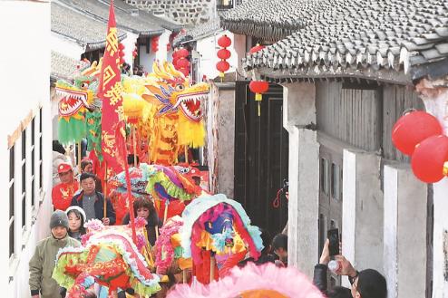 2月17日,民间艺人在常州焦溪古镇进行民俗巡游展演。 陈暐 摄