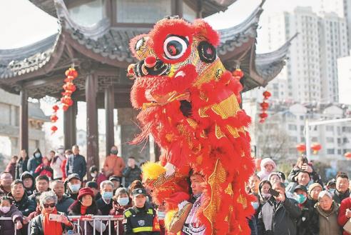 2月17日,民间艺人在淮安市清江浦区里运河文化长廊进行舞狮舞龙表演。 贺敬华 摄