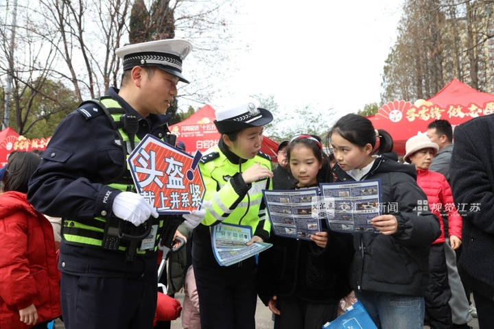 3月4日,宜兴市公安局交警大队的民辅警走进丁蜀镇龙溪公园,向群众讲解闯红灯等交通违法行为的危害性以及“一盔一带”的重要性。王杰 摄 视觉江苏网供图