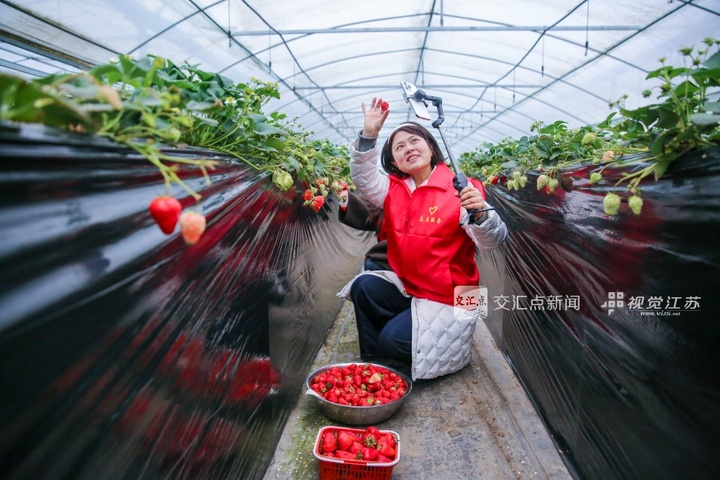 3月2日,南通如皋市东陈镇组织党员志愿者、村干部走进当地全红草莓基地,帮助种植户采摘成熟草莓,并通过线上推介拓宽销路。徐慧 摄 视觉江苏网供图