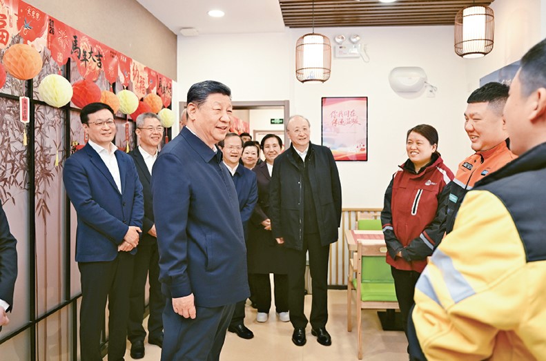 2026年2月9日至10日,中共中央总书记、国家主席、中央军委主席习近平在北京考察并看望慰问基层干部群众。这是10日上午,习近平在西城区新街口街道父母食堂考察时,同在这里休息的快递小哥亲切交流。 新华社记者 谢环驰/摄